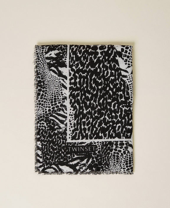 Куфия с животным принтом, люрексом в тонкую полоску контрастного цвета, обтрепанными краями и принтом с логотипом.