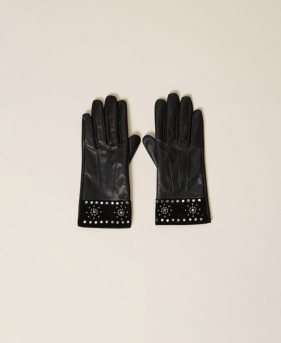 Кожаные перчатки с узором из стразов