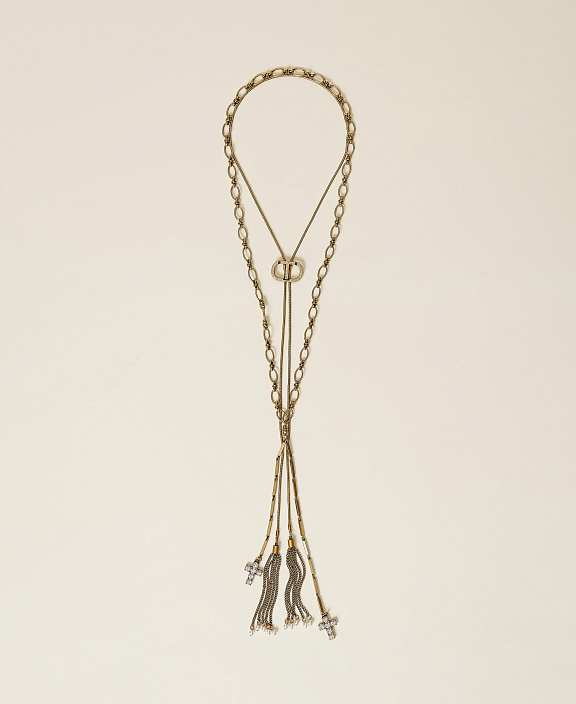 Вы можете носить их вместе или по отдельности, на свой вкус. Twinset представляет комплект, состоящий из регулируемого чокера с овальным Т-образным логотипом и стразами, с бахромой и жемчугом внизу, и ожерелье в виде витой цепочки с подвесками в виде крестов. Чтобы блистать стилем каждый раз, когда вам этого хочется.