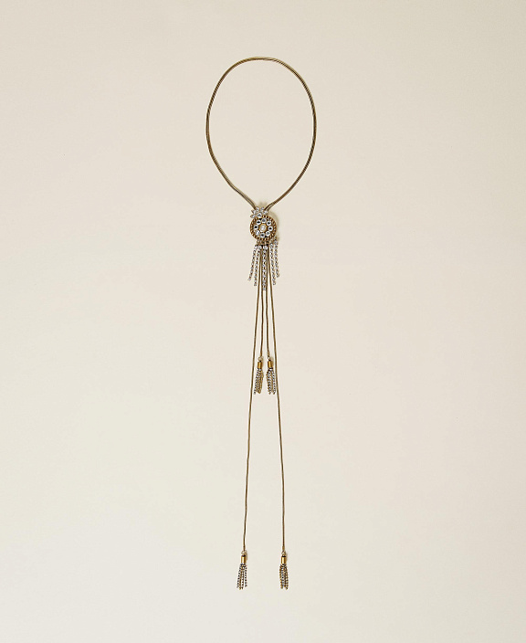 Колье-чокер с двойной скользящей регулируемой цепочкой, с кулоном-мандалой с жемчугом и шатонами и бахромой из стразов.