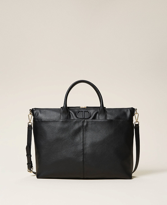 Мягкая сумка-шоппер с мелкозернистой структурой лицевой поверхности, с логотипом, двойной ручкой, съемным плечевым ремнем и двойной застежкой-молнией.