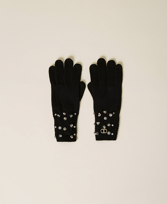 Перчатки узорной вязки, с вышивкой шатонами, бисером и пайетками ручной работы и логотипом.