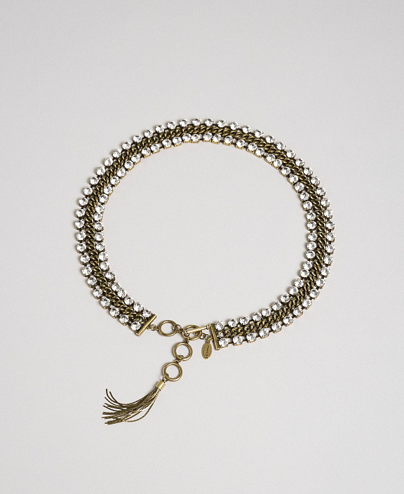Декоративный ремень-цепочка для высокой линии талии со стразами, регулируемой застежкой и кисточкой на концах.