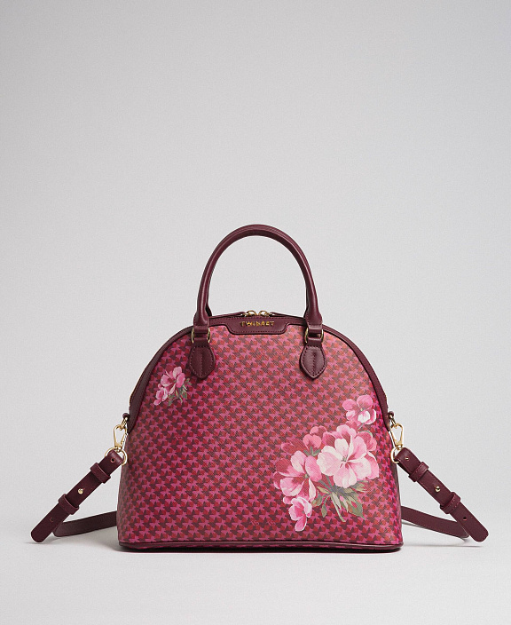 Сумка-саквояж из искусственной кожи с принтом в виде бабочек и герани, двойной ручкой, съемным плечевым ремнем и буквенным логотипом.
