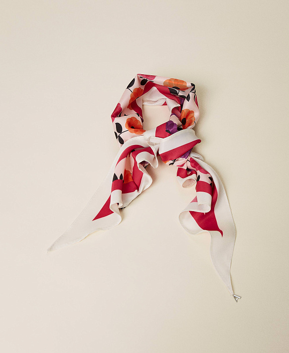Яркий платок с цветочным принтом и белым краем.