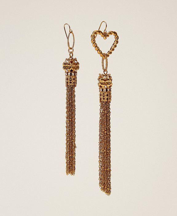 Роскошные серьги из металла/латуни золотистого цвета, украшенные кристаллами, изящными цепочками и подвеской в виде сердца с гравировкой логотипа TWINSET. Застежка-шпилька. Размеры: 13,5×1,5 см, подвеска 10×1,5 см. Эффектный аксессуар, который добавит гламурности любому образу. Идеально подходят как для вечерних мероприятий, так и для создания яркого повседневного look'а.