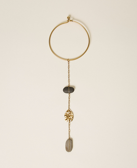 Латунное ожерелье с цепочкой, металлической подвеской с кованым эффектом и камнями. Изделие имеет застежку на штифт сзади и выгравированный логотип.