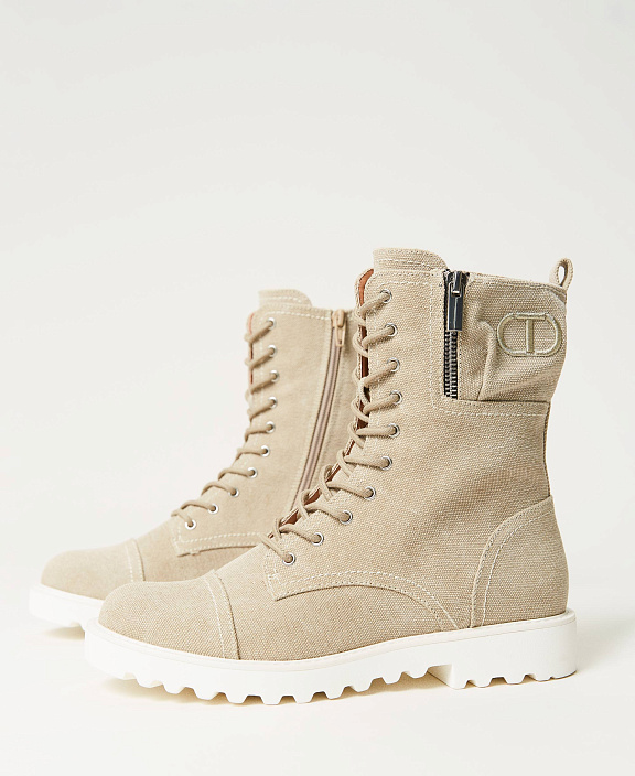 Ботинки-амфибии от Twinset, сочетающие в себе дерзкий дизайн и комфорт парусины, станут одной из самых эффектных моделей этого сезона. Модель украшена небольшим карманом сбоку, вышитым гладью новым логотипом Oval T, застежкой-молнией с внутренней стороны и резиновой подошвой. Ботинки привнесут дерзкий штрих в любой образ.