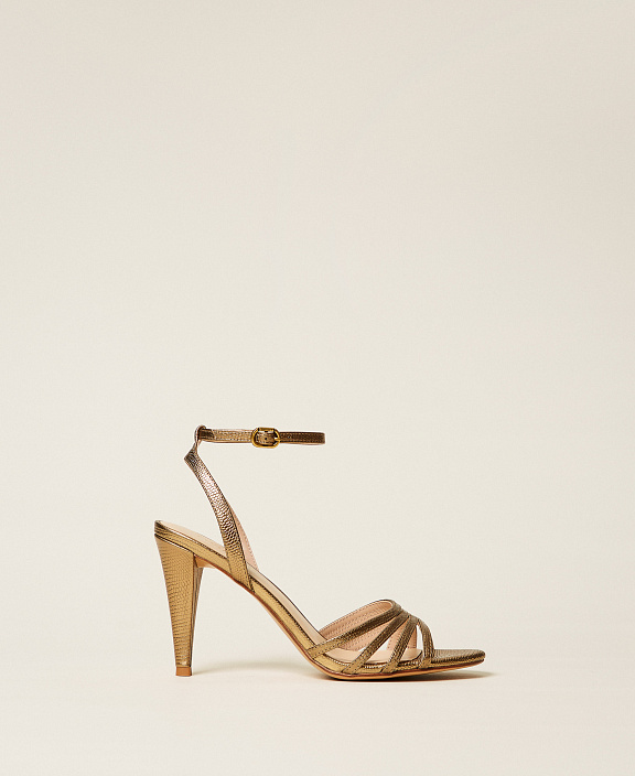 Высокие босоножки из ламинированной кожи с принтом под ящера, регулируемым ремешком на щиколотке и конусообразным каблуком.