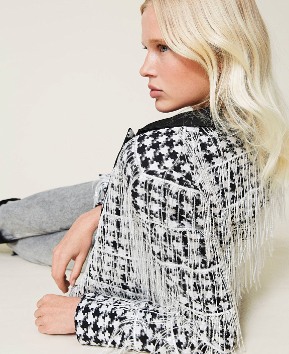 Блейзер из жаккардовой полушерсти с узором "гусиная лапка», расшитый бахромой из маленьких пайеток.