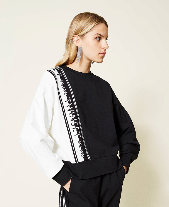 Черно-белая толстовка с ассиметричным расположением логотипа TWINSET Milano, круглым вырезом и спущенной линией плеча.