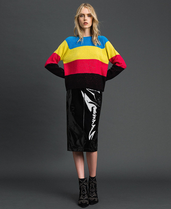Эта юбка-миди из искусственной кожи с лакированным эффектом является сегодняшним переосмыслением культовой текстуры 9-х годов. Она имеет прямой покрой, боковую застежку-молнию, разрез внизу сзади, центральную строчку спереди и сзади, блестящую позолоченную бляшку с логотипом в виде граненого сердечка на талии, без подкладки. Прекрасно сочетается с поп-расцветками и головокружительными каблуками.