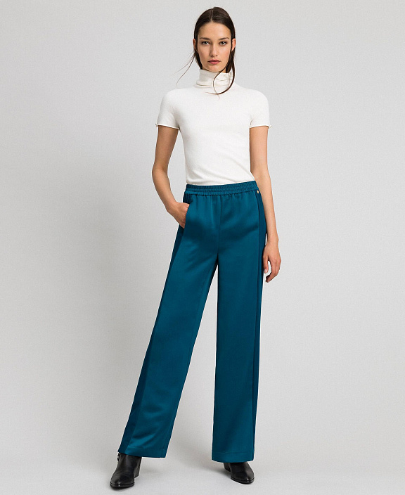 Брюки-палаццо из креп-сатина с эффектом матовой и блестящей поверхности, резинкой на талии и лампасами контрастного цвета.