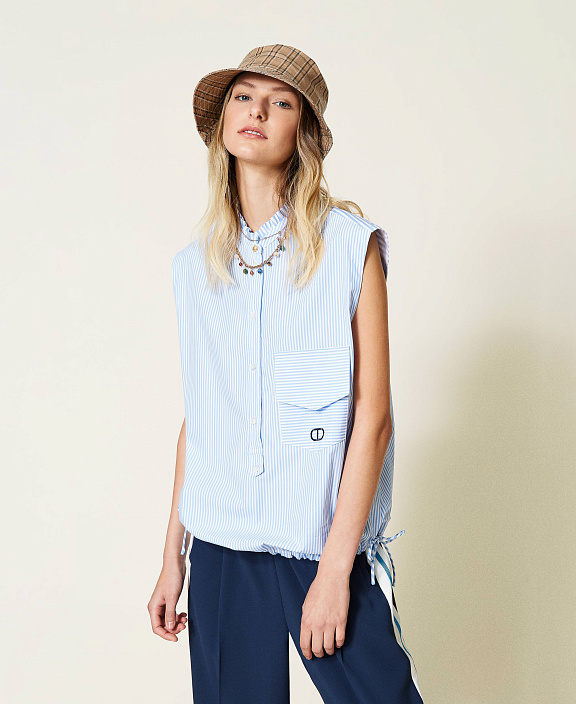 Этот топ из отрезов хлопкового поплина в равномерную полоску разной ширины для любительниц полосок в одежде. Он имеет прямой силуэт, регулируемый на талии с помощью кулиски, воротник-стойку с небольшим рюшем, нагрудный карман с логотипом Oval T, вышитым контрастной нитью, а также застежку-поло с первой пуговицей-украшением. Он будет легко сочетаться со всеми вашими юбками и брюками.