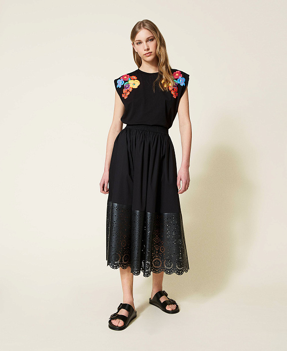 Юбка-миди из эластичного хлопкового поплина с лазерным узором на легкой ткани с полимерным покрытием.
