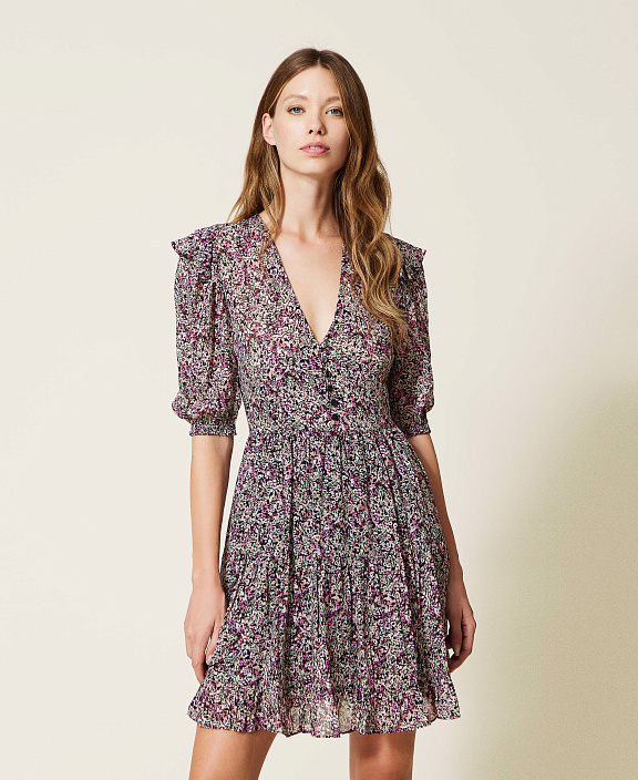 Короткое платье из легкого креп-шифона с цветочным принтом, V-образным вырезом и оборками.