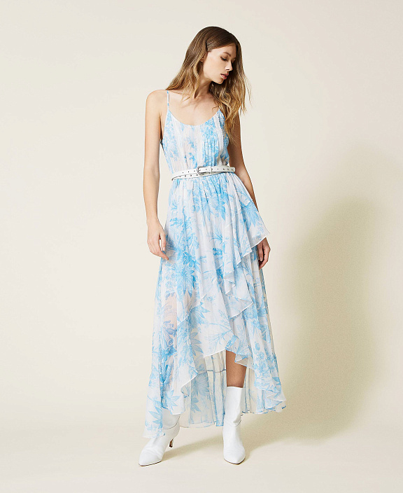 Нежное, романтичное и неосязаемое. Выберите для особого случая это длинное платье из легкого итальянского креп-шифона с цветочным принтом туаль-де-жуи эксклюзивного дизайна Twinset. Оно имеет тонкие бретельки, лиф с мелкими складками и вставками из валансьенского кружева с узором пуэн-деспри, боковой молнией, оборкой внизу и выполнено на подкладке. Сказочное длинное платье, которое не останется незамеченным.
