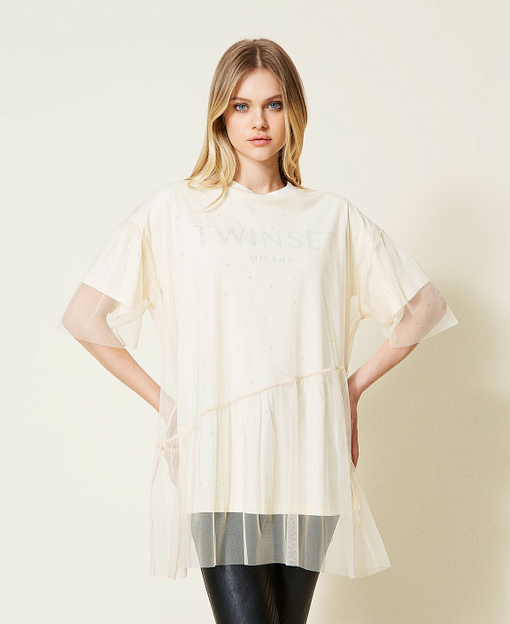 Футболка из хлопкового джерси с вышивкой хрусталиками и логотипом по всей поверхности, подбитая тюлем с оборками.