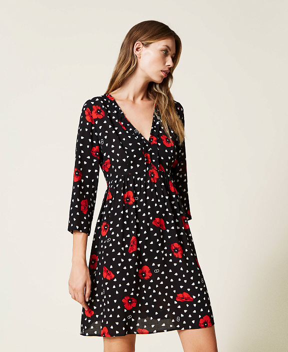 Это женственное и утонченное короткое платье из крепдешина с эксклюзивным принтом Twinset в виде сердечек и маков имеет расклешенный силуэт, V-образный вырез с рюшами, рукава три четверти, боковую молнию, и выполнено без подкладки. Романтичное, ограниченной серии, уместное даже на работе.