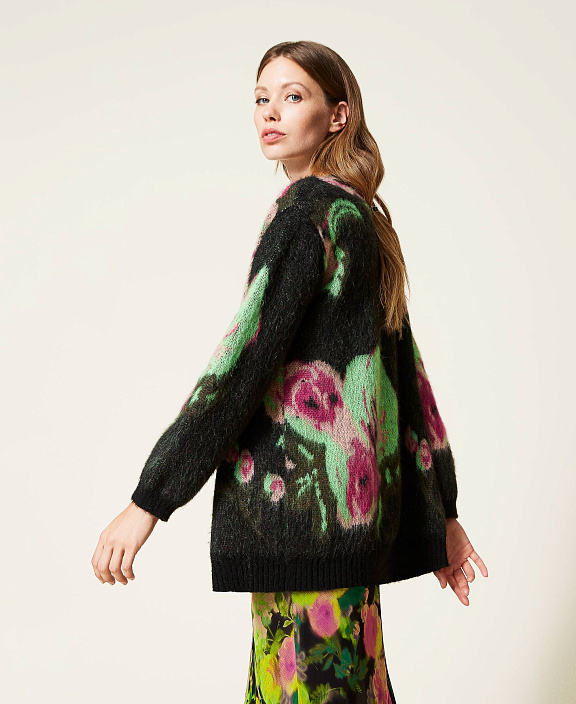 Жаккардовый кардиган с начесом свободного силуэта из смесового мохера с цветочным узором, с V-образным вырезом и застежкой на пуговицы.
