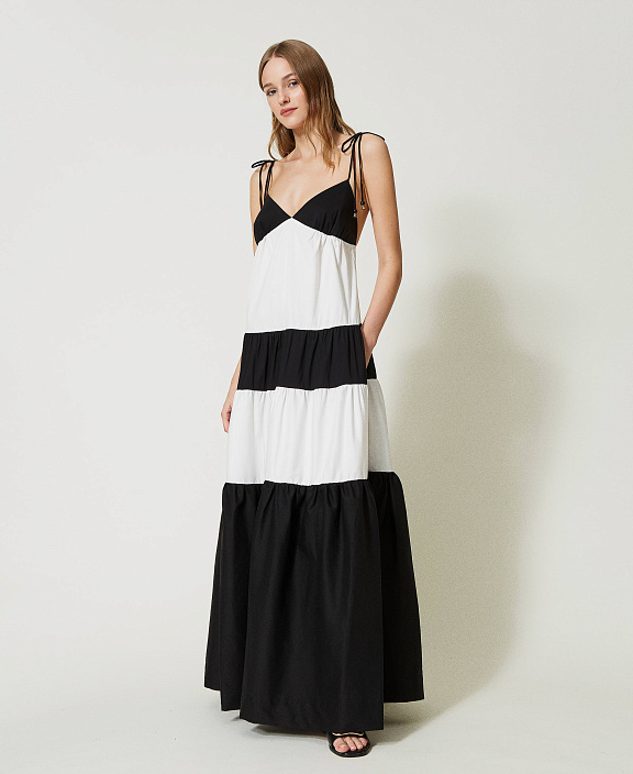 Длинное поплиновое платье с двухцветными оборками, завязывающимися бретельками, V-образным вырезом и боковыми карманами.