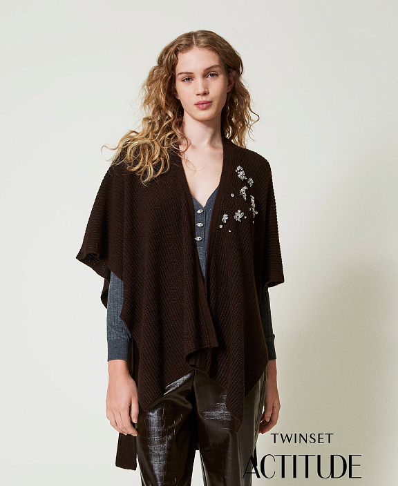 Открытое пончо из коллекции Actitude, вязанное в кукурузную резинку, с вышивкой шатонами и стразами, боковыми разрезами и асимметричным подолом.