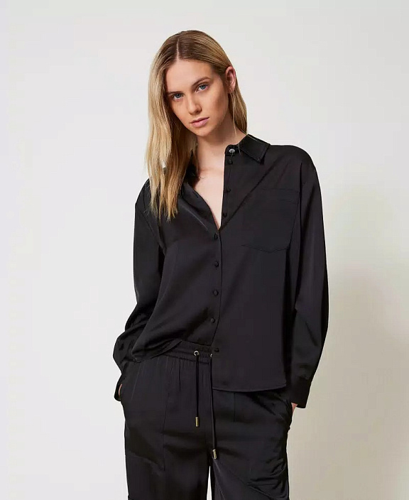 Атласная рубашка прямого силуэта с отложным воротником, накладным карманом, застежкой на пуговицу-украшение и обтяжные пуговицы, длинными втачными рукавами с манжетами на пуговице, кокеткой со складкой-гармошкой сзади и металлической пластинкой с логотипом в форме сердечка.