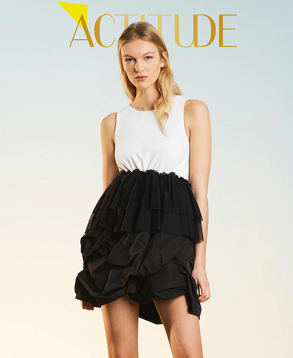 Короткое платье из джерси с круглым вырезом горловины, пышной юбкой из тафты и присборенными оборками из тюля. Это изделие входит в состав коллекции Actitude.