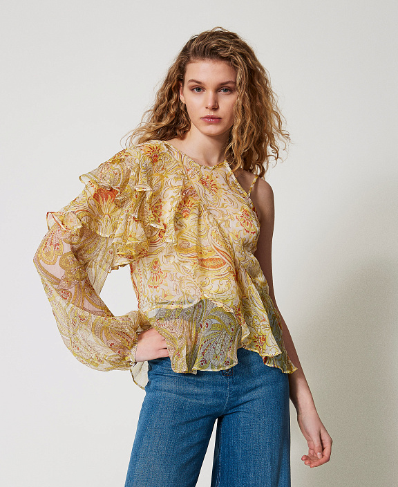 Модель по предоплате. Блузка на одно плечо Salina итальянского производства из легкого шелкового креп-шифона с принтом пейсли эксклюзивного дизайна Twinset. Принт представляет собой сочетание традиционного узора пейсли с размытыми живописными элементами. Модель имеет свободный силуэт, круглую горловину с тесемкой на плече, диагональные оборки, длинный рукав с манжетой и нижний топ из вискозного жоржета.