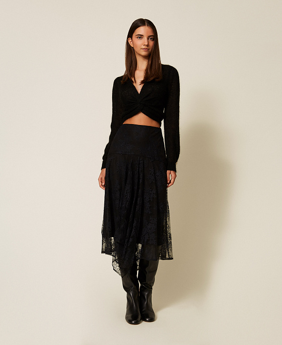 Длинная кружевная юбка свободного силуэта с фигурной отрезной баской, создающей драпировку с клиновидными концами по подолу, застежкой-молнией сбоку и подкладкой. Эта модель является частью линейки Archive, вдохновленной самыми знаковыми и популярными изделиями из коллекций Twinset.