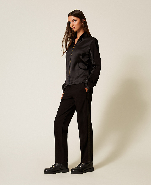 Комплект из трикотажа, прямые брюки и бомбер с атласными вставками