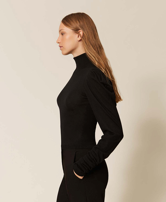 Джемпер из коллекции Actitude из смесовой вискозной пряжи с драпировкой на плечах. Модель имеет облегающий силуэт, воротник-стойку, длинные рукава и металлическую пластинку-логотип на спинке.