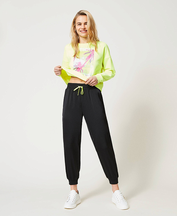 Брюки-джоггеры из технического атласа с флуоресцентной шнуровкой, боковыми карманами, манжетами в резинку и рельефной отстрочкой спереди.