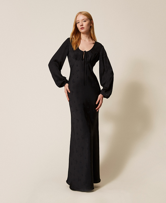 Длинное платье в пол из мягкой струящейся ткани, подчёркивающее линии силуэта и визуально вытягивающее фигуру. Изящный вырез с декоративной завязкой добавляет утончённости, а длинные рукава с лёгким объемом создают воздушный, женственный акцент. Платье идеально садится по фигуре, не стесняет движений и дарит ощущение комфорта. Подходит для вечерних выходов, фотосессий и особых случаев.
