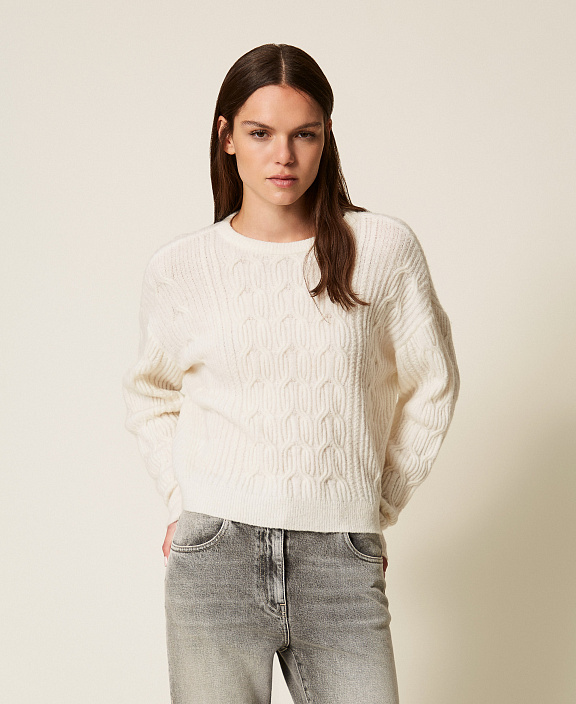 Уютный джемпер из теплой шерстяной смеси с эффектной вязкой косами на передней части и рукавах. Круглый вырез, длинные рукава, резинка на манжетах и по низу. Мягкая ткань премиального качества обеспечивает тепло и комфорт. Идеален для создания элегантных осенне-зимних образов.