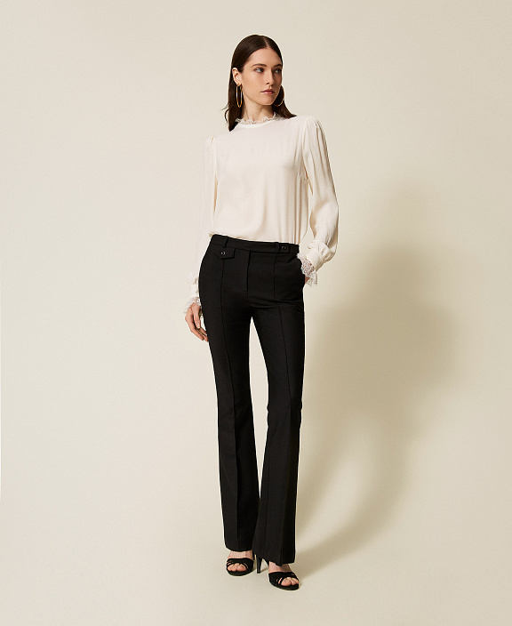 Блузка из полушелкового жаккардового крепдешина итальянского производства с шевронным узором. Модель имеет прямой силуэт, стоячий воротник с отделкой рюшами, длинные рукава с манжетами и оборками, присборенные по пройме, и застежку на обтяжные пуговицы сзади.