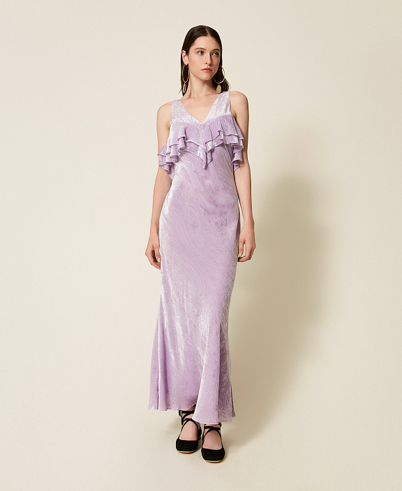 Длинное платье из пан-бархата из шелка и вискозы с кашемировым узором деворе в тон эксклюзивного дизайна Twinset. Модель имеет приталенный силуэт, V-образный вырез горловины с двойным рюшем, глубокий вырез на спине, трубчатую ленту, завязывающуюся на спине, застежку-молнию сбоку и подкладку из вискозного жоржета длиной до колена.