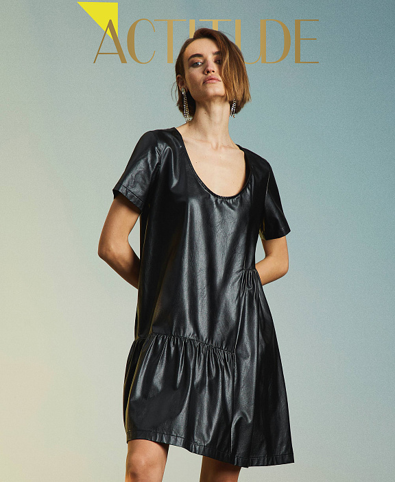 Короткое платье асимметричного кроя из ткани с полимерным покрытием. Модель с присборенными оборками и короткими рукавами застегивается на молнию. Это изделие входит в состав коллекции Actitude.