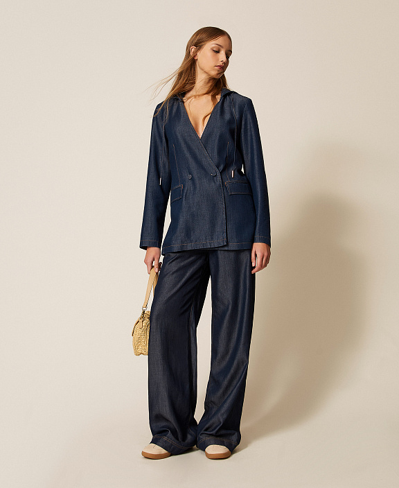 Брюки из шамбре с поясной резинкой на кулиске с металлическими наконечниками, косыми карманами, швами, продублированными строчкой табачного цвета, и металлическим логотипом в форме сердечка сзади.