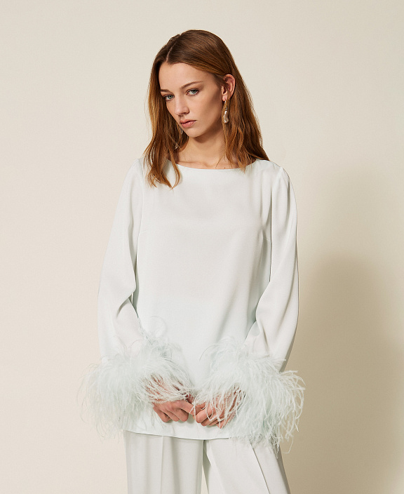 Блуза свободного силуэта с чистой архитектурой линий, дополненная эффектными манжетами с декором из нежных перьев. Лёгкая струящаяся ткань красиво драпируется и создаёт мягкий, воздушный образ. Круглый вырез подчёркивает изящество шеи, а удлинённый крой делает модель универсальной для сочетаний с брюками или юбками.