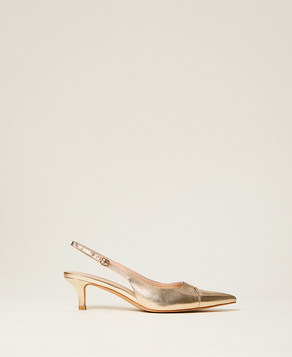 Кожаные туфли-слингбэки с металлическим логотипом, заостренным мыском, низким каблуком-шпилькой и подошвой из тунита.