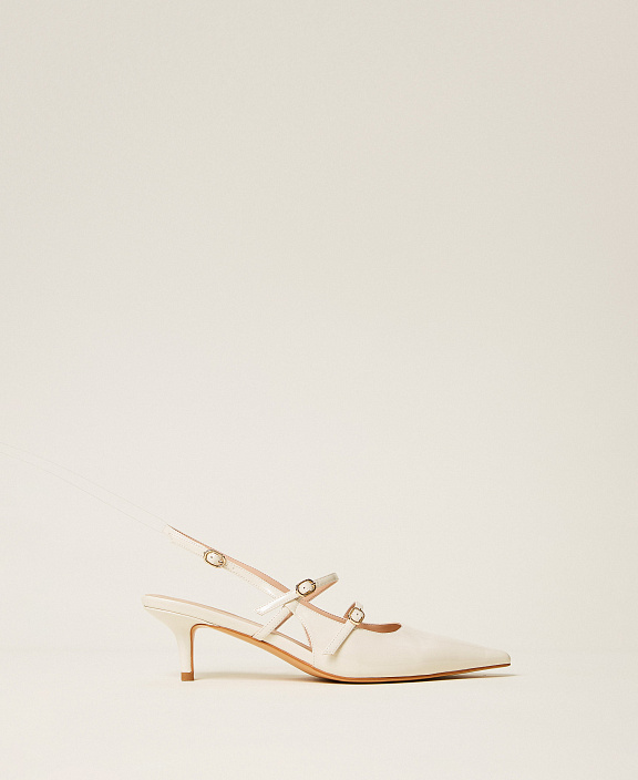 Туфли-слингбэки, выполненные из ремешков, с заостренным мыском, на низком каблуке-шпильке и подошве из тунита.