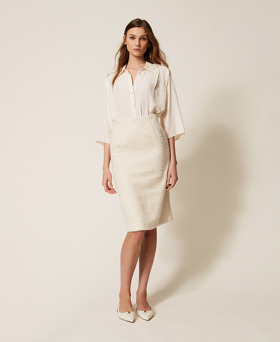 Прямая юбка миди в бежевом оттенке, полностью расшитая мелкими пайетками. Модель на подкладке со скрытой молнией и разрезом сзади. Идеальный выбор для вечерних образов — сочетайте с лаконичными топами и жакетами для элегантного эффекта.