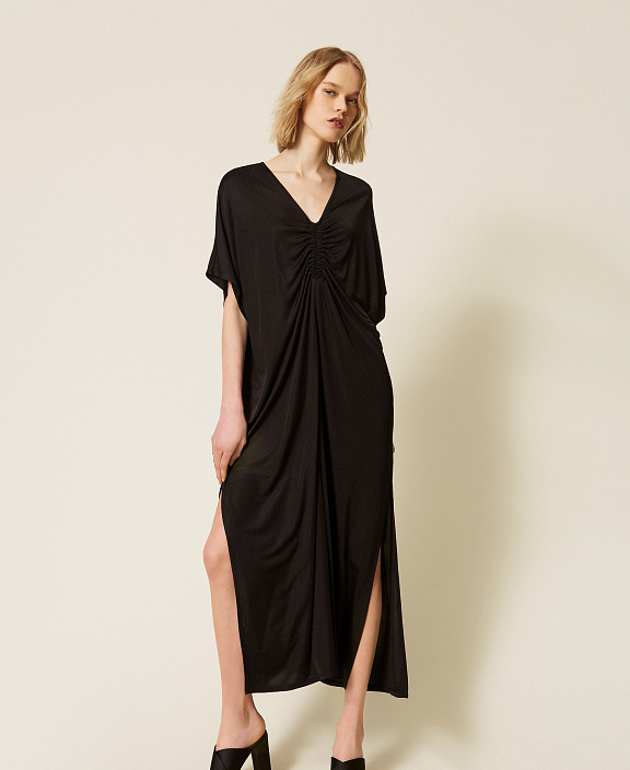 Платье из плотного структурированного трикотажа, оформленное контрастной окантовкой по краю. Прямой силуэт подчёркивает линии фигуры, а декоративные пуговицы добавляют нотку элегантности. Округлый вырез и безупречная посадка делают модель универсальной — платье легко адаптируется под дневные и вечерние образы, сохраняя фирменную эстетику Twinset.