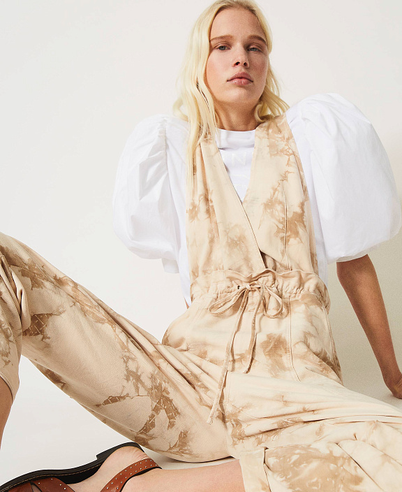 Комбинезон из твила на основе хлопка и лиоцелла, вручную окрашенного в технике "тай-дай», с V-образным вырезом, запахом, поясом на кулиске и накладными карманами.