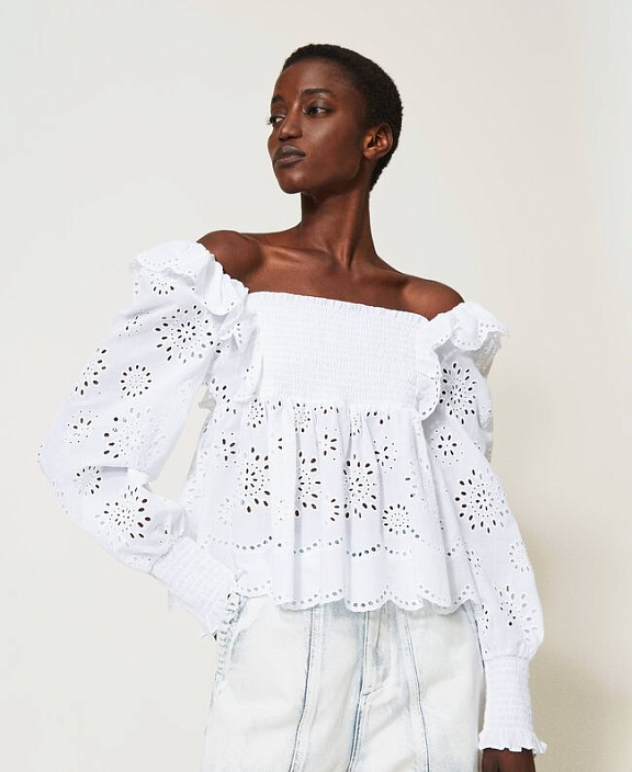 Блуза из хлопкового муслина с шитьем Сангалло, длинными присборенными рукавами с воланом, и фестончатой каймой.