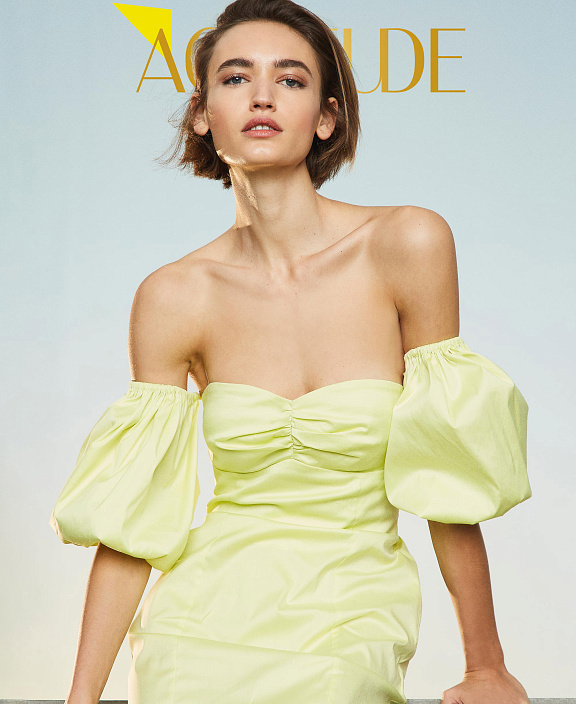 Короткое платье-футляр из поплина с присборкой на чашках, съемными широкими рукавами-буфами и застежкой-молнией сбоку. Это изделие входит в состав коллекции Actitude.