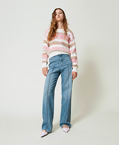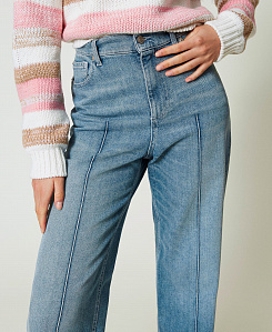 Для модного городского аутфита выберите джинсы с потертостями и краями, украшенными цепочкой из стразов, сочетая их с футболкой с логотипом и босоножками на плоской подошве. Если же вы предпочитаете более объемный крой, выберите джинсы модели «balloon» или широкие джинсы. Непременным атрибутом весенне-летнего гардероба являются летние и джинсовые шорты, пересмотренные в стиле Twinset с помощью патчей с вышивкой, которые подойдут и для особых случаев.