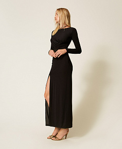 Если вы предпочитаете универсальные решения, обратите внимание на платье-комбинацию на тонких бретелях в сочетании с джемпером. Нет необходимости думать, что накинуть на плечи — итальянские дизайнеры всё предусмотрели и предложили оптимальный вариант: черное длинное платье в пол + легкий джемпер из смесовой вискозы.