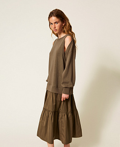 Ультрамодная модель — трикотажное платье миди с рукавом и асимметричной юбкой в глубоком синем оттенке. Этот выбор позволит выглядеть роскошно в будни и в особенные моменты. Если хочется купить платье миди, которое будет вас выделять, это идеальный вариант. В таком образе вы будет собирать комплименты даже от незнакомых людей.